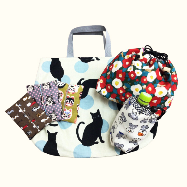 丁寧に手づくりした布小物は、巾着やトートバッグが人気です。園児用のスモックやレッスンバッグもかわいい柄の綿素材で好評です。